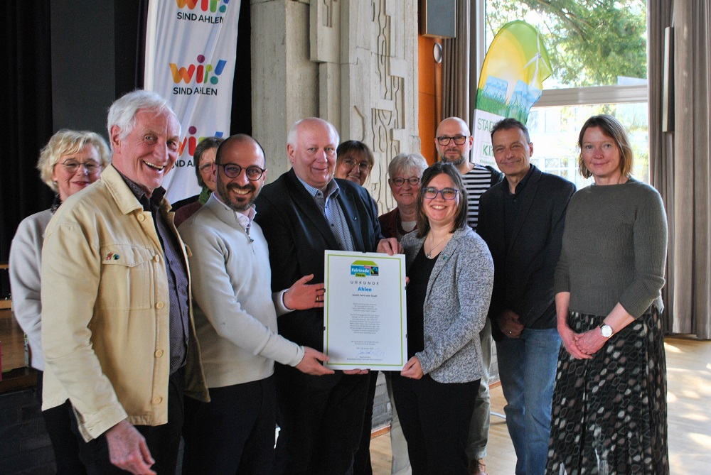 Seit über acht Jahren ist Ahlen nun Vorzeigestadt in Sachen „Fairer Handel“. So einen Titel bekomme man wahrlich nicht geschenkt. Ahlen habe mit Bravour die erforderlichen Kriterien für die Auszeichnung gemeistert, so ein sichtlich begeisterter Manfred Holz in Richtung Bürgermeister Matthias Harman und an die Steuerungsgruppe um Linda Sauer und Meinolf Thiemann.