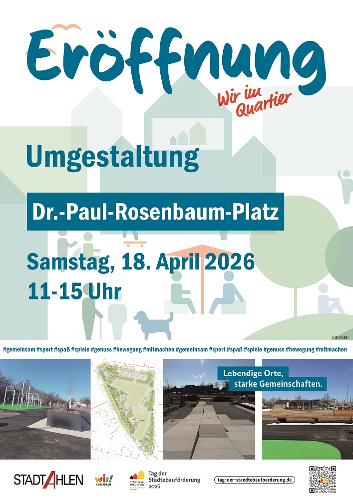 Die Besucherinnen und Besucher erwartet ein lebendiger Nachmittag, der die vielfältigen Nutzungsmöglichkeiten des Platzes erlebbar macht. Künftig soll der Dr.-Paul-Rosenbaum-Platz wieder als zentraler Treffpunkt im Quartier dienen. Der Entwurf für die Neugestaltung des Dr.-Paul-Rosenbaum-Platzes stammt vom Berliner Büro „Franz Reschke Landschaftsarchitektur“, das sich in einem Wettbewerb gegen sieben weitere Beiträge durchgesetzt hatte. Ziel war es, die in die Jahre gekommene Fläche im Ahlener Südosten zu einem attraktiven Aufenthaltsort mit ganzjähriger Nutzung zu entwickeln.