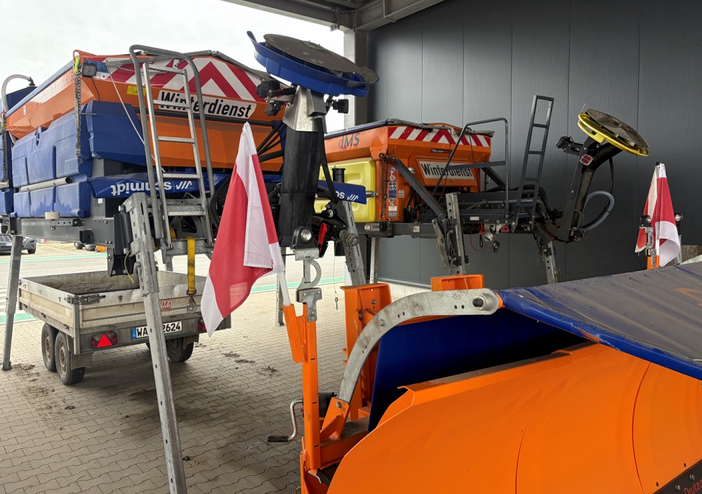 Zum Einsatz kommen bis zu vier Großstreuer für Salz-Sole-Mischungen, zwei kleinere Fahrzeuge und drei Traktoren, die flexibel umgerüstet werden können: mit Schneeschiebern oder Bürsten, je nach Bedarf. Gestreut wird mit einer 21-prozentigen Sole, die bei sogenannter „schwarzer Glätte“ zum Einsatz kommt, also bei Straßen, die feucht glänzen und bei denen man kaum erkennt, ob sie nass oder vereist sind.