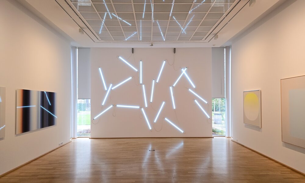 Die Präsentation im Kunstmuseum Ahlen wurde in enger Zusammenarbeit mit Agathe Weishaupt erarbeitet, die die Sammlung nach dem Tod ihres Mannes (2018) weiter betreut. Thematische Räume, etwa zu Erscheinungsformen des Lichts, zur Kunst der 50er- und 60er-Jahre oder zum Prinzip der Faltungen, wechseln mit Künstlerräumen von Camill Leberer und David Nash. Neuentdeckungen wie die meditativ-strengen Arbeiten koreanischer Künstler treffen auf Stars der Kunstszene wie Sean Scully oder Sol LeWitt. Erstmals sind auch mehrere künstlerische Arbeiten von Maximilian Weishaupt zu sehen, der sich, geprägt von seinen Erfahrungen als Architekt, nicht nur intensiv mit Räumen, geometrischen Körpern und Oberflächen beschäftigt, sondern auch das Element „Zeit“ in seine Werke eingeflochten hat.